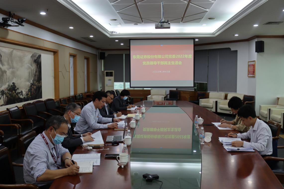 根据市纪委、市委组织部、市委督导组的工作安排部署,2月13日,东莞证券党委领导班子召开2022年度党员领导干部民主生活会。东莞证券党委书记陈照星主持会议,全体班子成员出席会议;市国资委党委副书记、纪检监察组组长张健芬同志,纪检监察组副组长雷德坚同志到会指导。