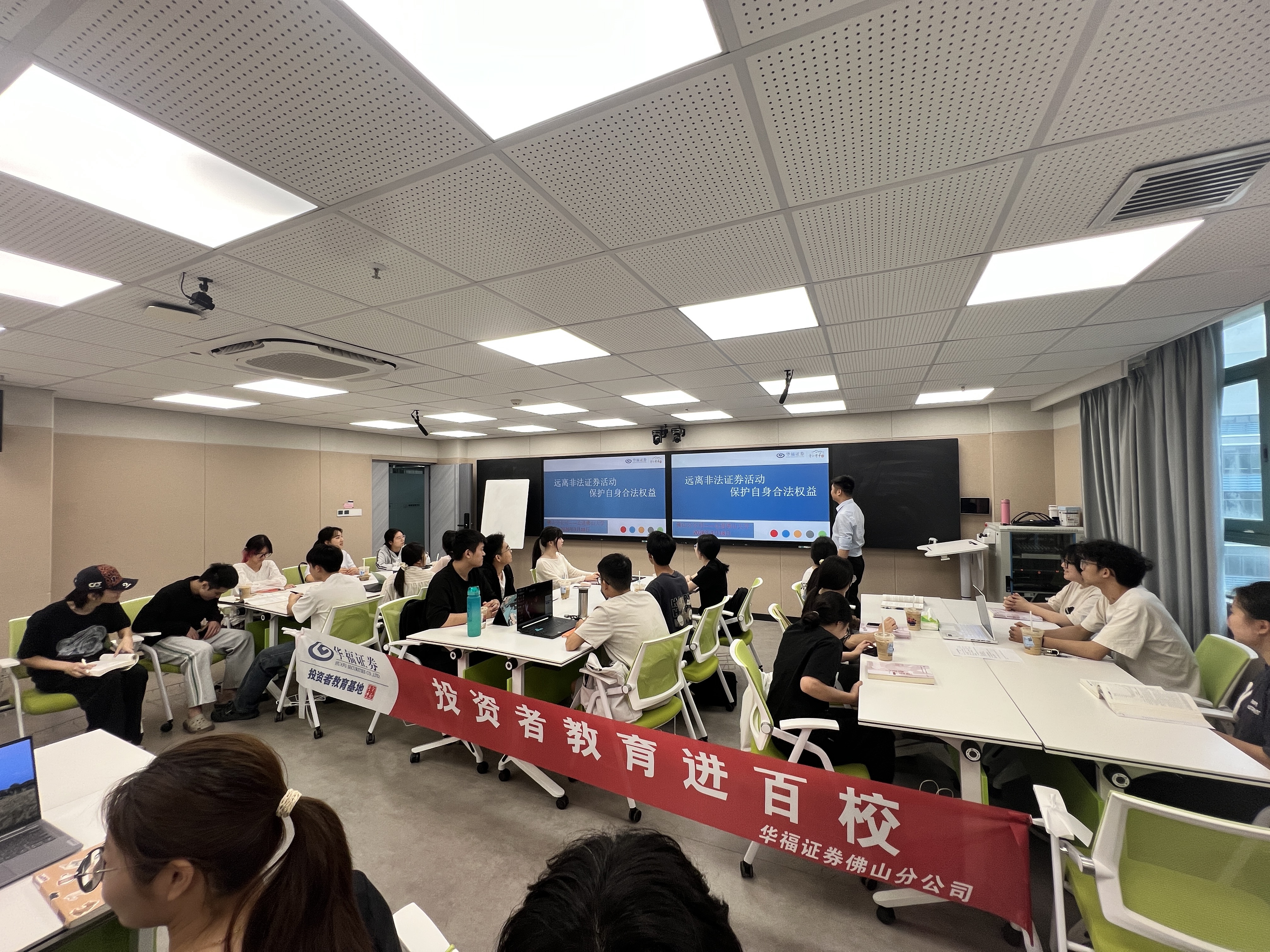 2026年3月18日,华福证券佛山分公司投教团队走进佛山大学经管学院,成功举办“远离非法证券活动,保护自身合法权益”主题投资者教育讲座,师生积极参与。