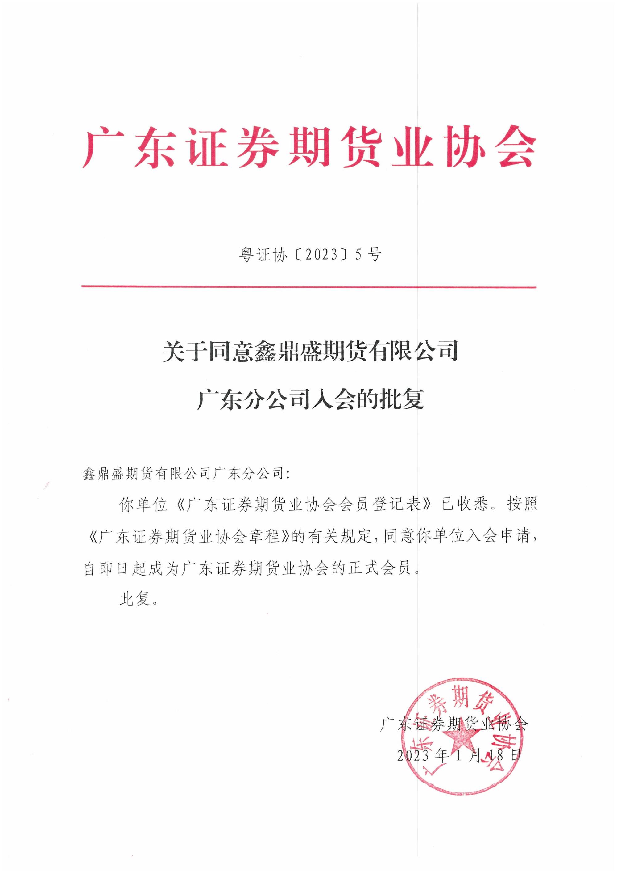 关于同意鑫鼎盛期货有限公司广东分公司入会的批复