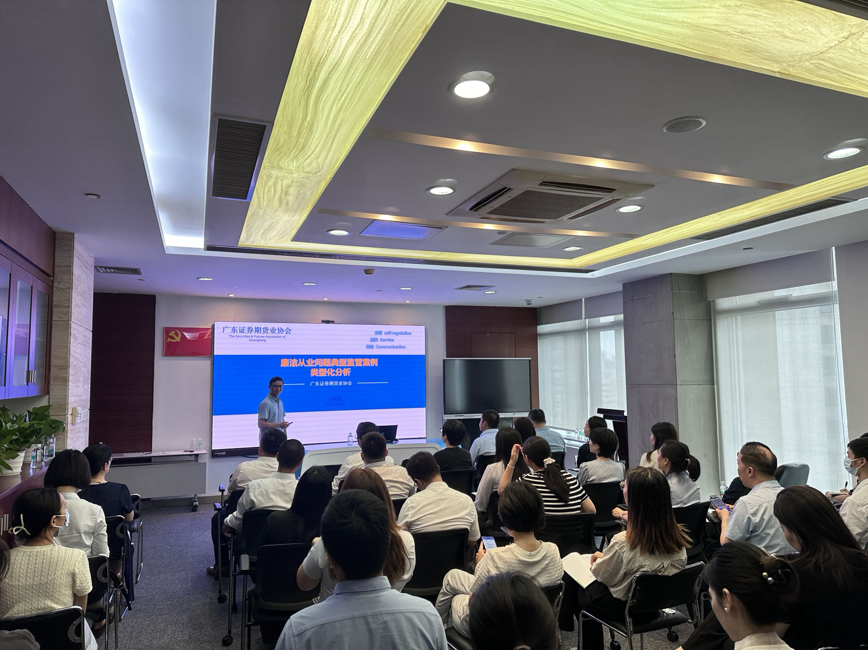 6月26日,广东证券期货业协会(以下简称“协会”)举办2024年第二期合规沙龙活动。活动由协会合规部主任胡永雄主讲,辖区44家证券期货经营机构近60名从业人员参加了本次活动。